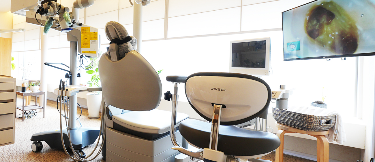 根管は暗く、また大変細く複雑な構造になっているため、根の治療では歯科医師の手の感覚と勘 が頼りでした。しかし、マイクロスコープ(歯科用顕微鏡)の使用により、患部を最大20倍まで 拡大し、肉眼で細部まで確認しながら治療を行うことができます。これにより治療精度が大幅に 向上し、再治療のリスクも低減できます。